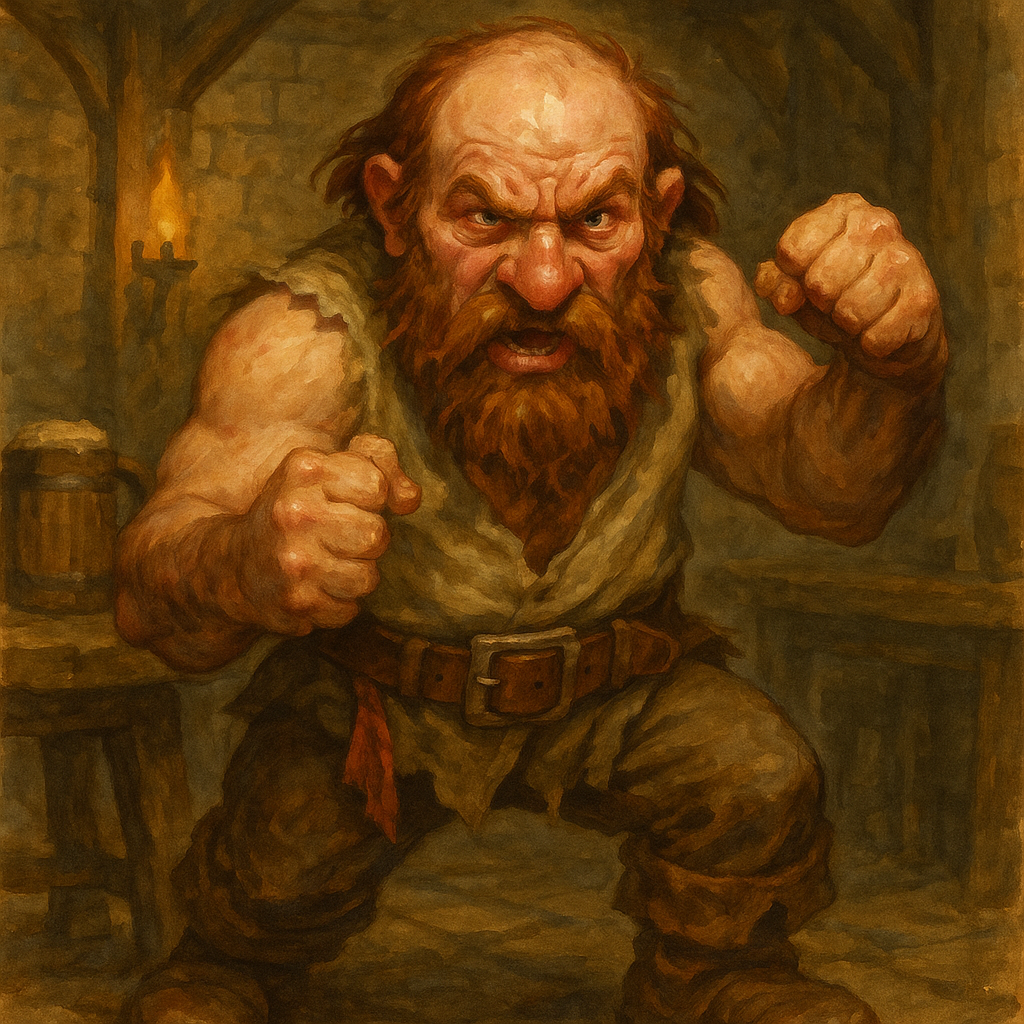 It is pure chaos. Everyone at the tavern is either fighting or trying to avoid getting hit. Dalngram is trying to get everyone to quiet down but it’s too late, they won’t listen. After rolling for initiative, he will try to lead Laurent to safety behind the stage, fending off drunken patrons on the way. Moreau will follow them from a distance, expertly navigating through the crowd and dodging attacks from all directions (taking the Disengage Disengage