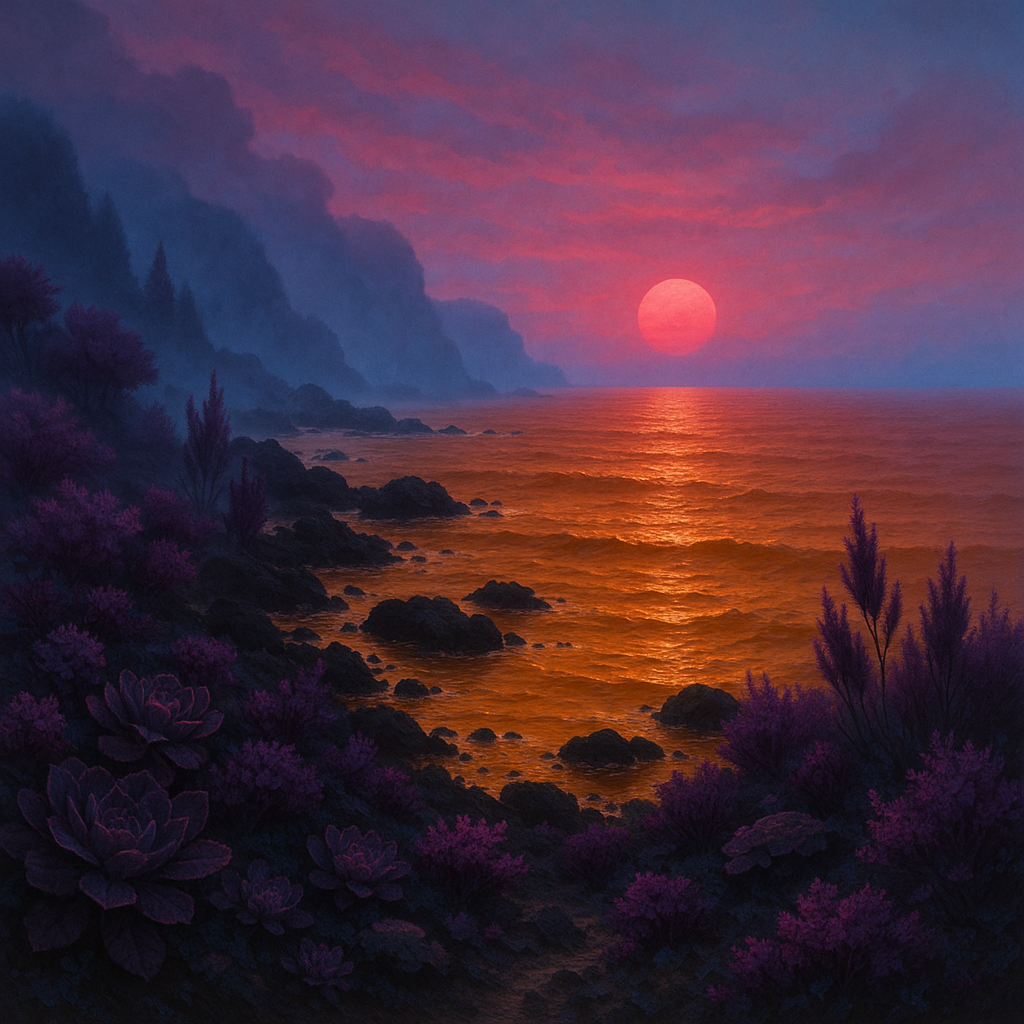 The fourth planet from Ausaria. It seems blue from space, and is considered a habitable planet. From its surface, the sunlight has a pink, reddish hue to it, as a result of the thick and hazy atmosphere’s blue tint which filters out much of the shorter-wavelength light. Shadows have a warm, amber tone, and the plants and foliage are mostly purple and black in color. Albaxia completes an orbit around Ausaria every 104.5 Albaxian days (or approximately 640 Terrestrial days).