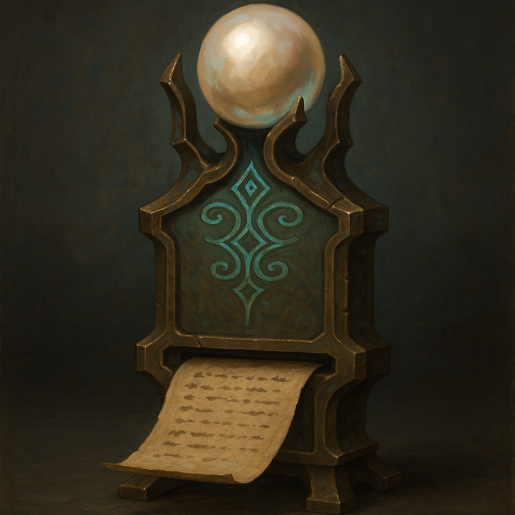 This enchanted device is capable of analyzing objects and atmospheres using magic. In order to get an output from this device, you need to insert a small piece of parchment into the slot at the bottom. It has two modes.