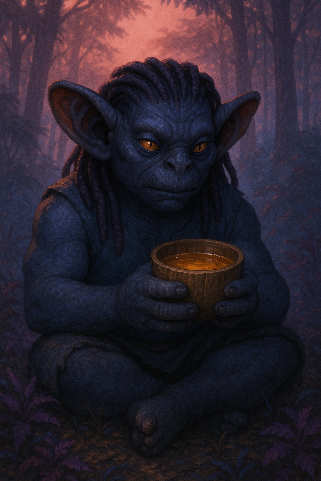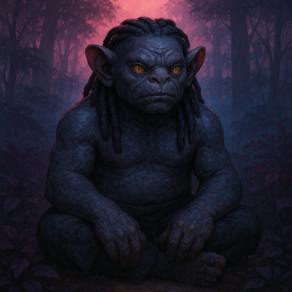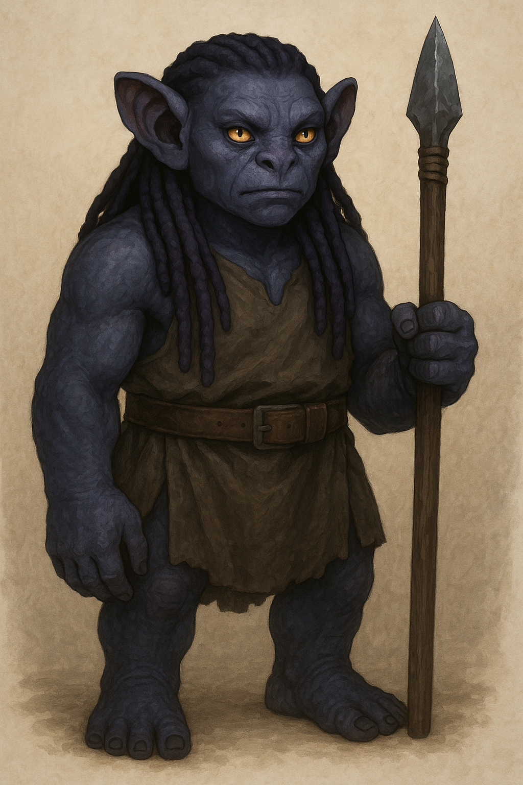 Mauvians have a short, broad build. Their skin is leathery, almost hide-like, and its color ranges from deep indigo to slate grey, matching the flora and fauna on Albaxia. Their hair grows in dark violet or jet black dreadlocks, and their eyes have slit-shaped, feline pupils and amber colored irises. Their ears are large and cupped forward, capable of capturing vibrations in the ground, and they have no visible nose bridge, just wide slit nostrils.